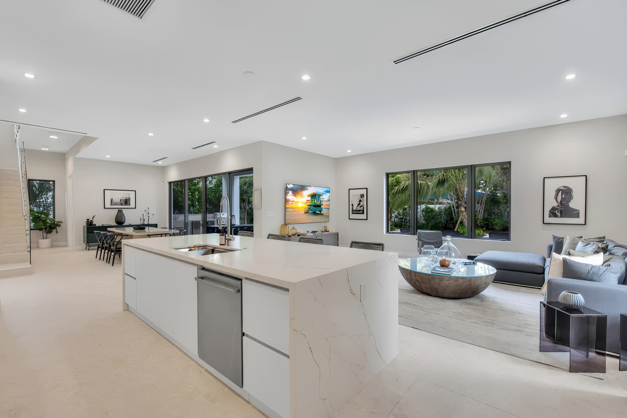 Inside, wood plank limestone tiles grace the floors, enhancing the modern and welcoming ambiance. The stunning custom kitchen boasts 12’ kitchen island quartz countertops with a waterfall finish, complemented by high-end stainless steel appliances. From built-in micro/oven combos to cook-tops, wall hoods, and wine coolers, this kitchen is a culinary haven, perfect for hosting private chef dinners.