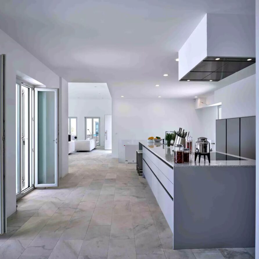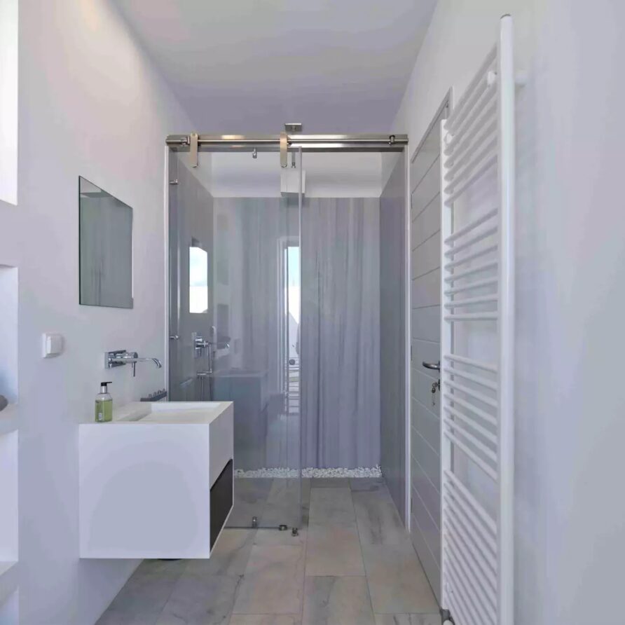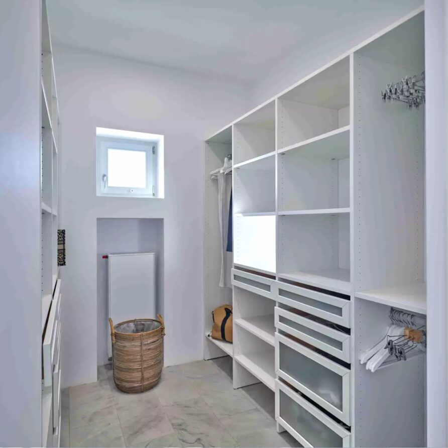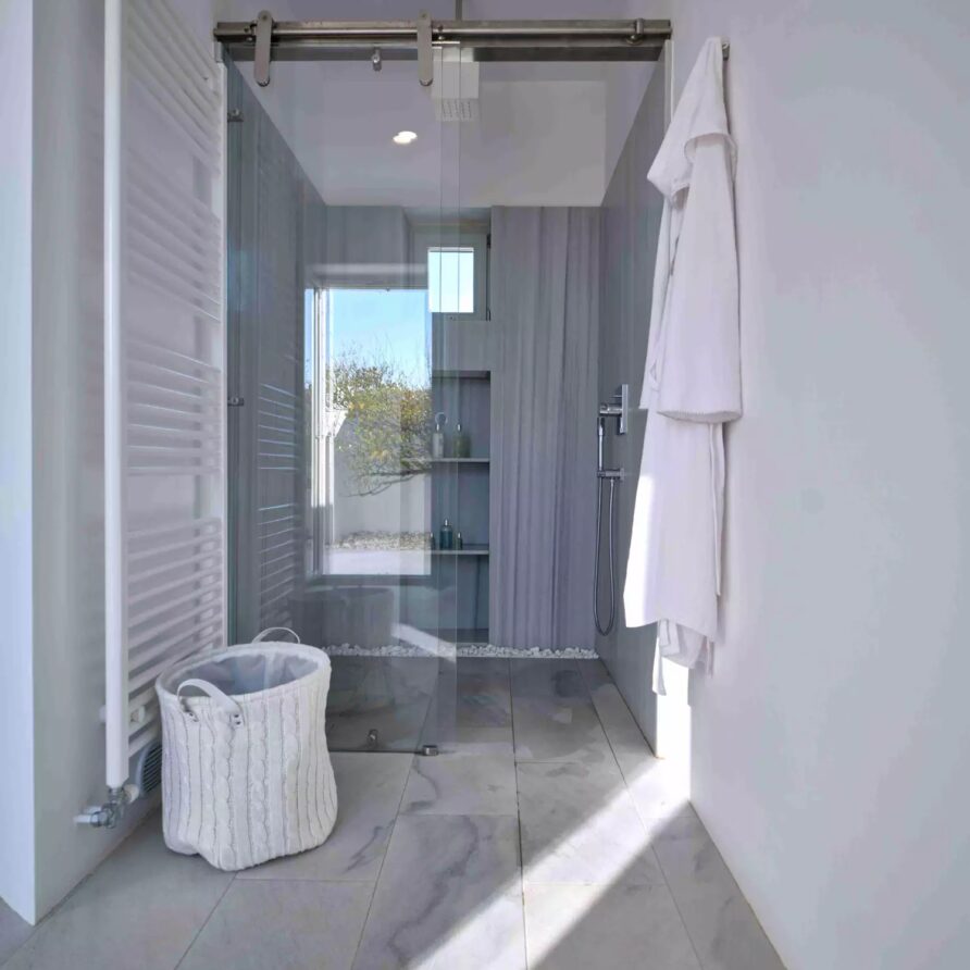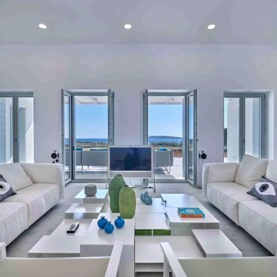 As soon as you enter the house, you will come across a voluminous living room where the white and off-white colors are the prevailing sensation of the space along with the totally minimal furnishings. This is an open-plan space that also features the contemporary, fully equipped kitchen and the dining area of the villa. A master bedroom with walk-in closet, en-suite bathroom and sauna for four is found further in the ground level. The property also features 4 more double en-suite bedrooms independently accessed from the terrace with kitchenette and queen size sofa beds.