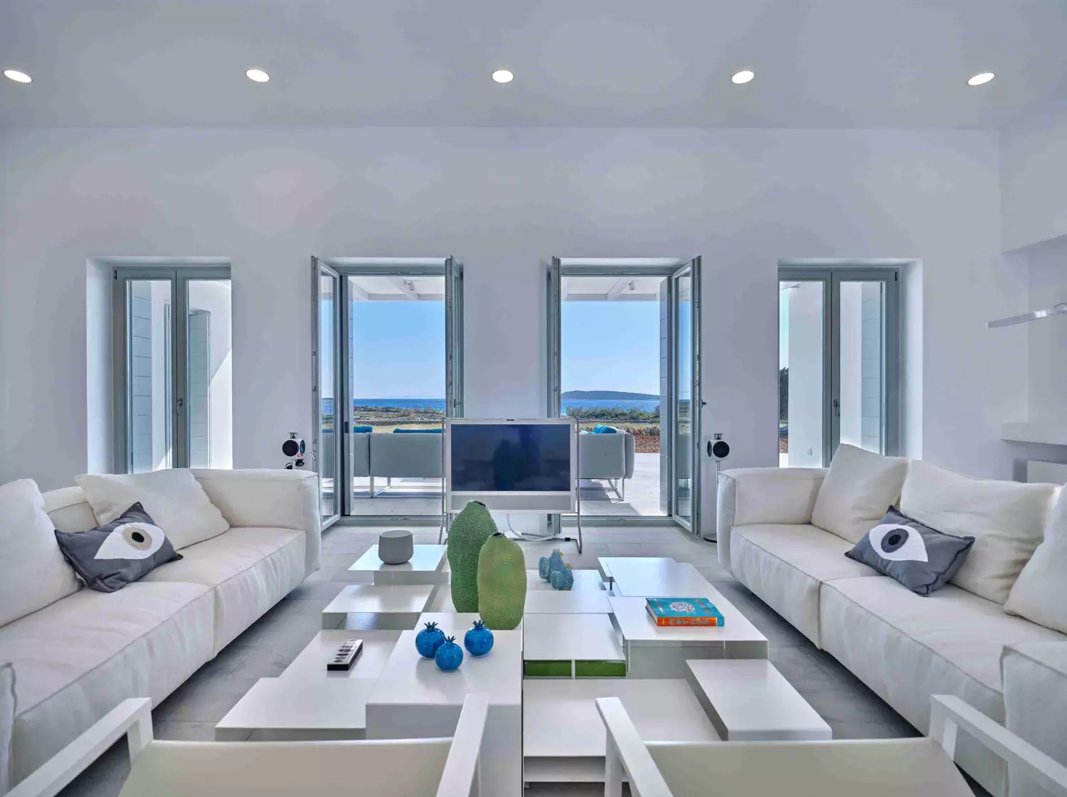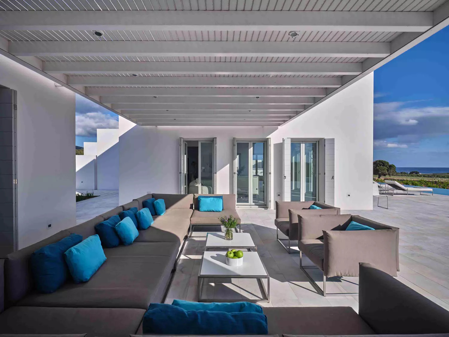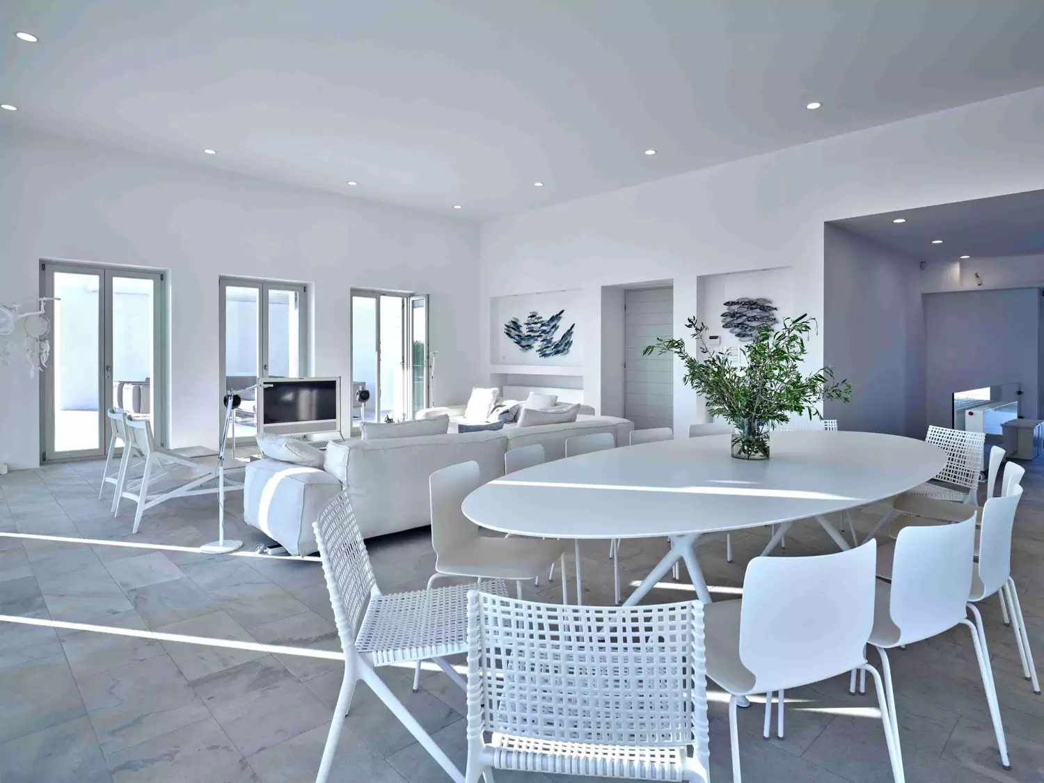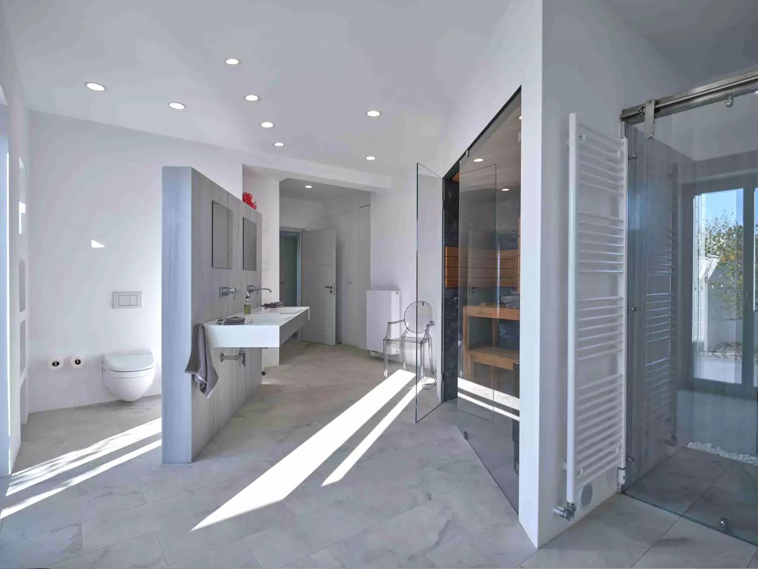 As soon as you enter the house, you will come across a voluminous living room where the white and off-white colors are the prevailing sensation of the space along with the totally minimal furnishings. This is an open-plan space that also features the contemporary, fully equipped kitchen and the dining area of the villa. A master bedroom with walk-in closet, en-suite bathroom and sauna for four is found further in the ground level. The property also features 4 more double en-suite bedrooms independently accessed from the terrace with kitchenette and queen size sofa beds.