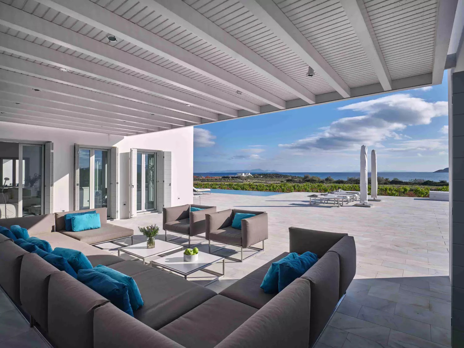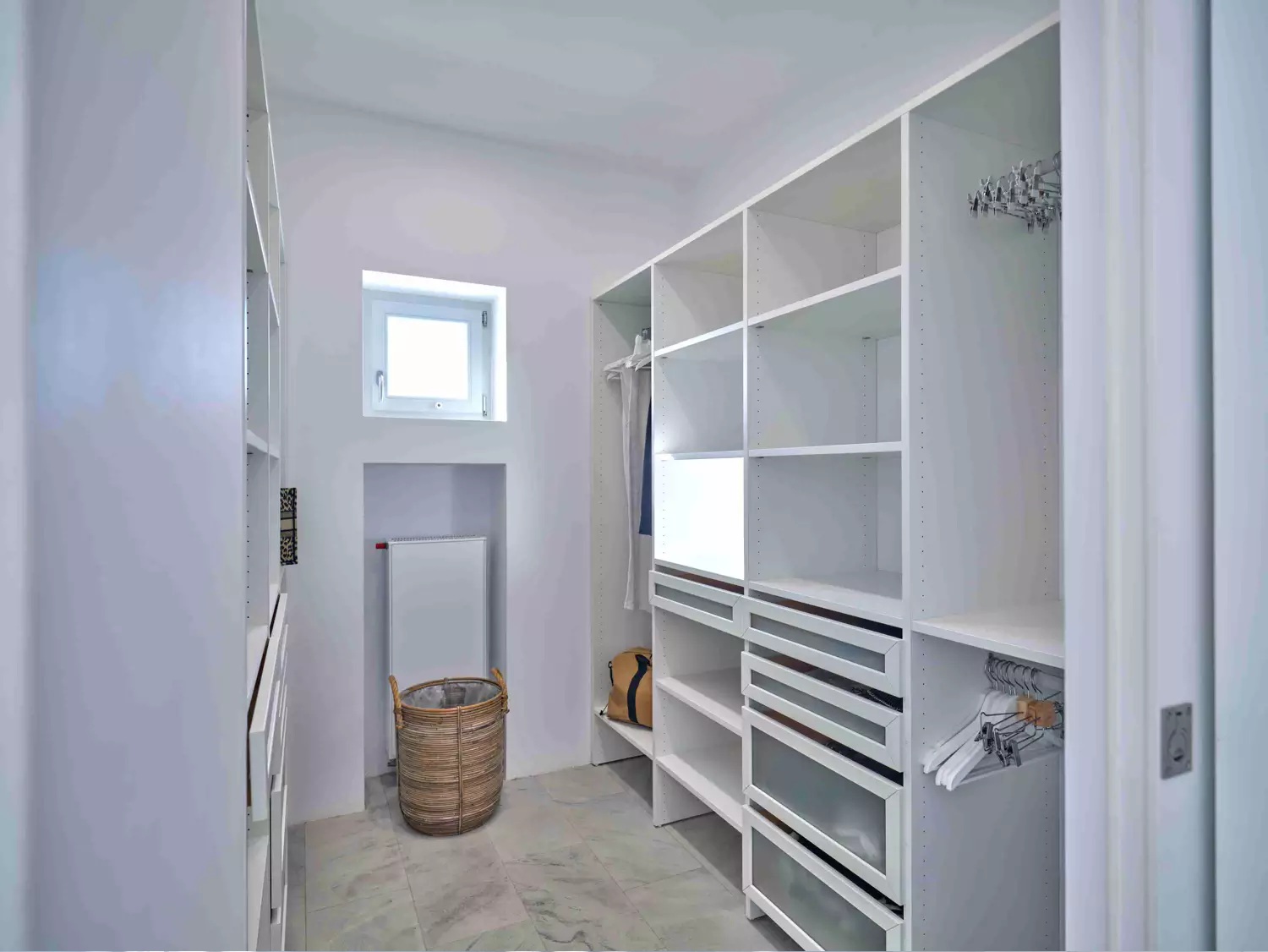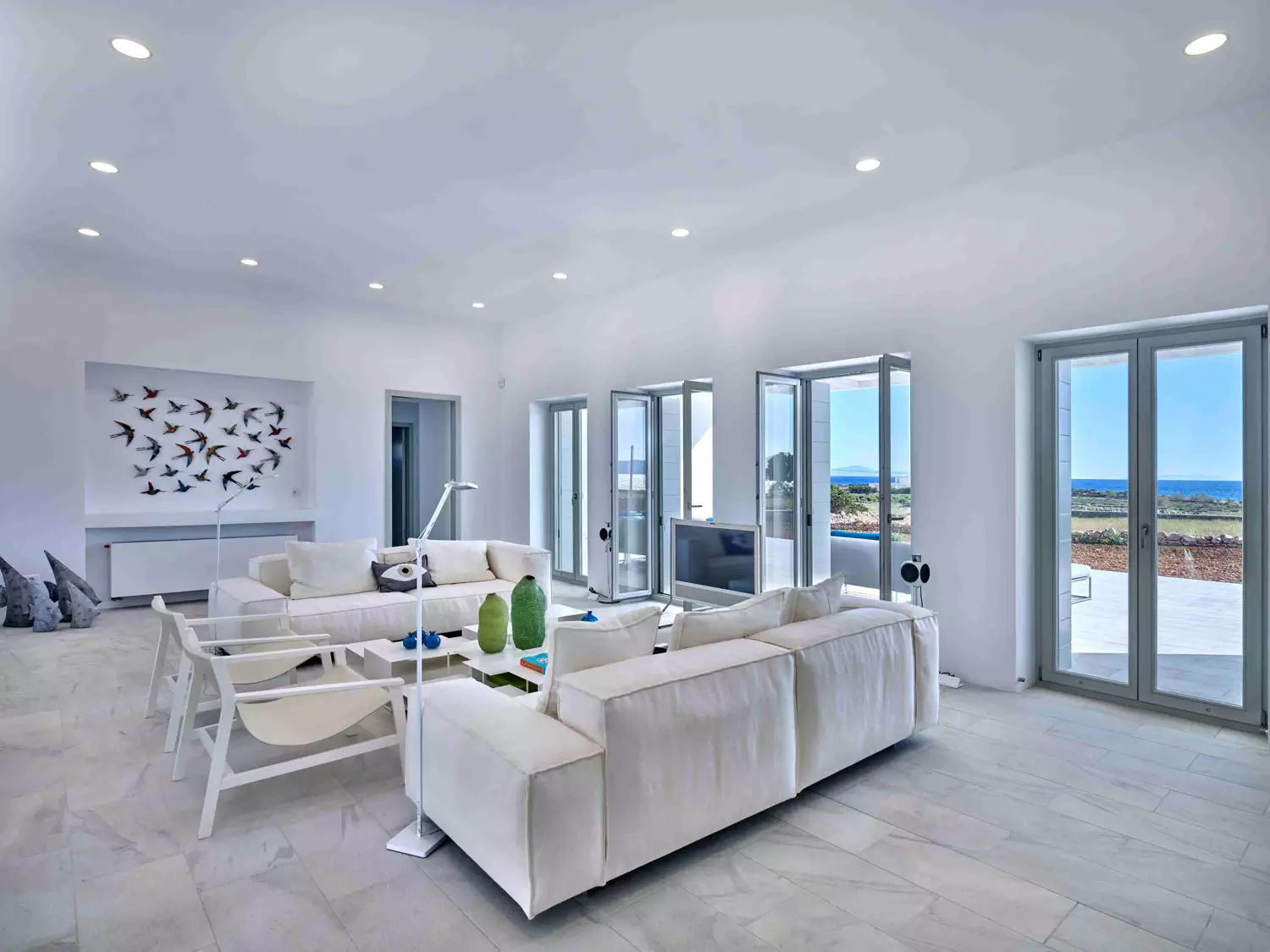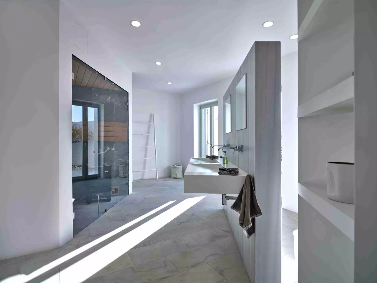 As soon as you enter the house, you will come across a voluminous living room where the white and off-white colors are the prevailing sensation of the space along with the totally minimal furnishings. This is an open-plan space that also features the contemporary, fully equipped kitchen and the dining area of the villa. A master bedroom with walk-in closet, en-suite bathroom and sauna for four is found further in the ground level. The property also features 4 more double en-suite bedrooms independently accessed from the terrace with kitchenette and queen size sofa beds.