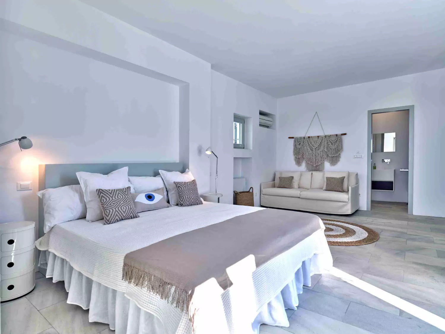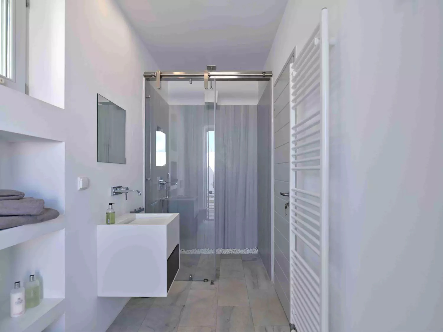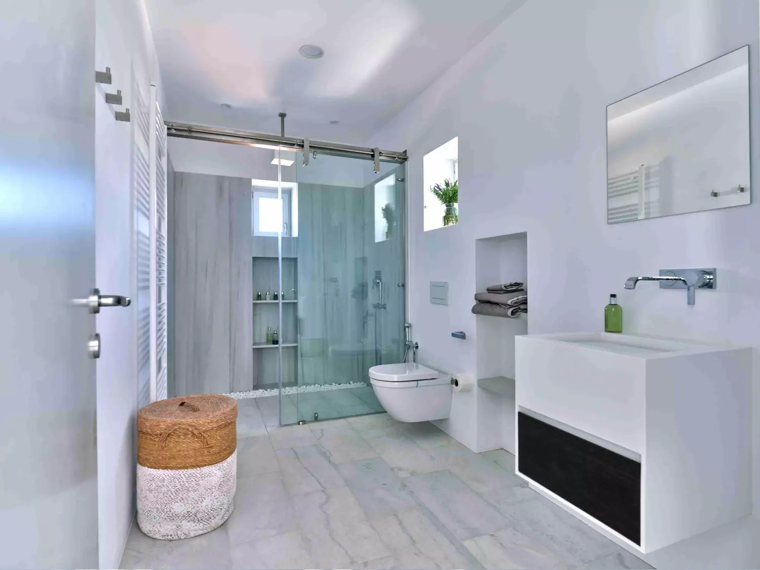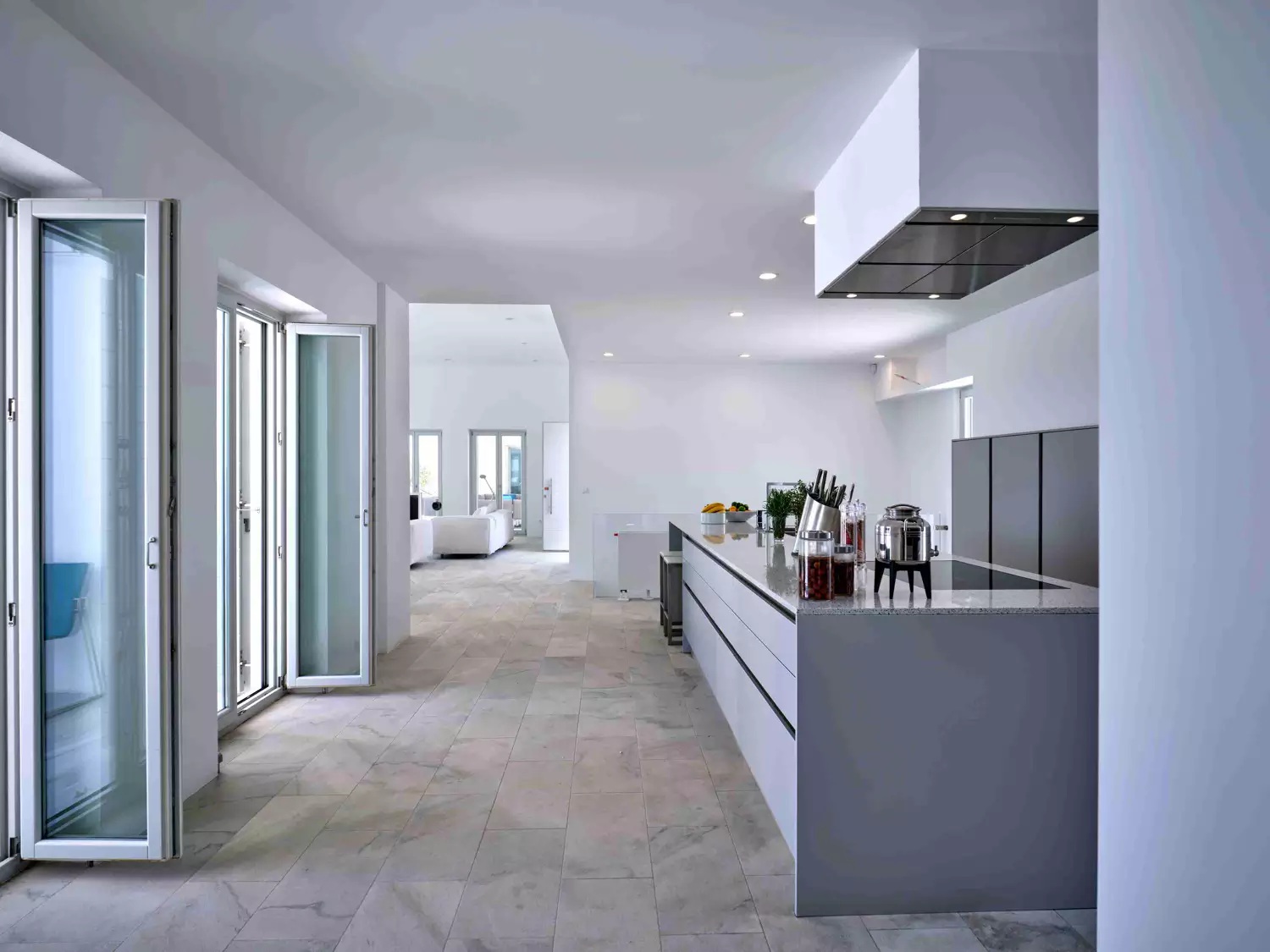 As soon as you enter the house, you will come across a voluminous living room where the white and off-white colors are the prevailing sensation of the space along with the totally minimal furnishings. This is an open-plan space that also features the contemporary, fully equipped kitchen and the dining area of the villa. A master bedroom with walk-in closet, en-suite bathroom and sauna for four is found further in the ground level. The property also features 4 more double en-suite bedrooms independently accessed from the terrace with kitchenette and queen size sofa beds.