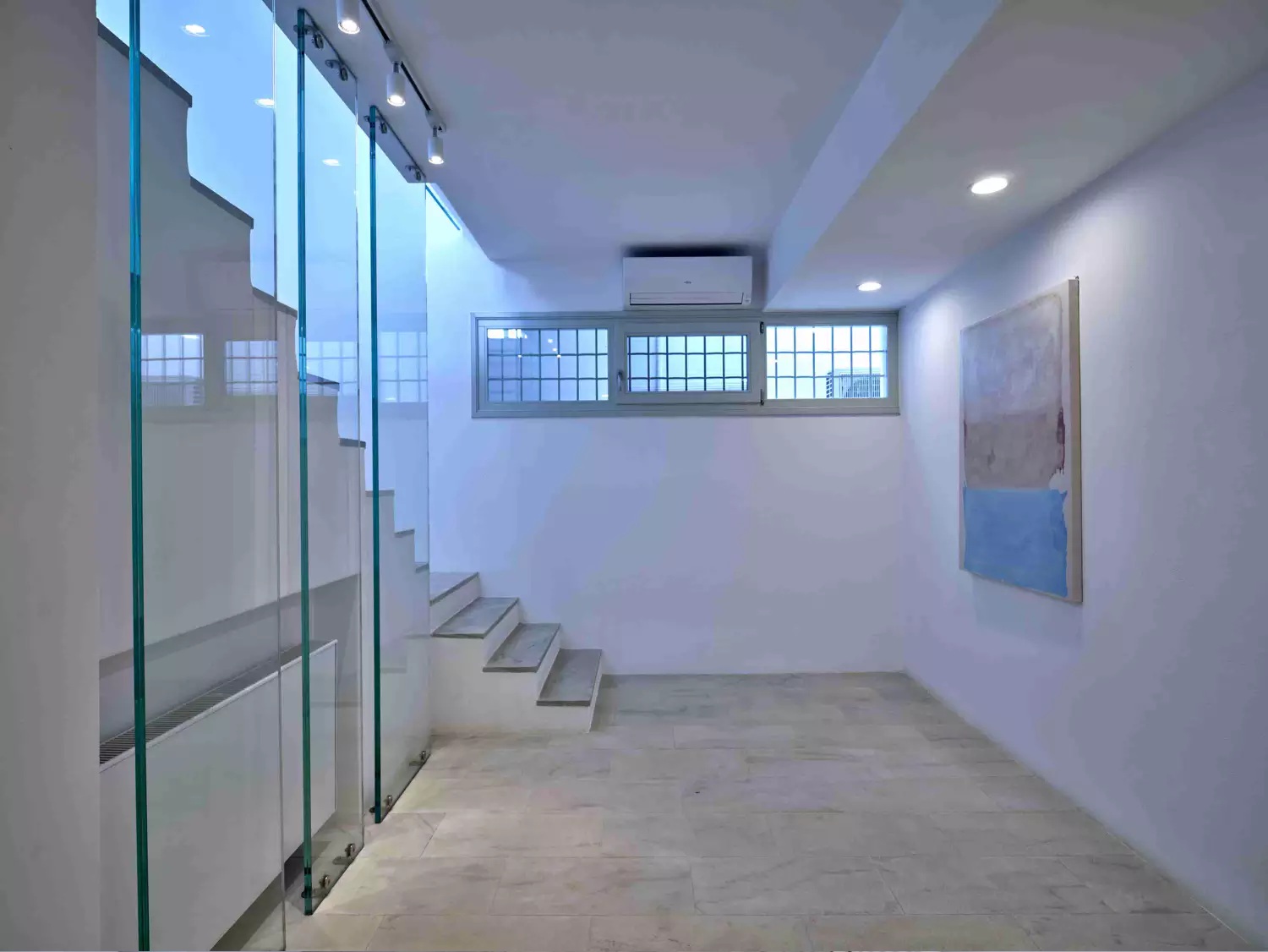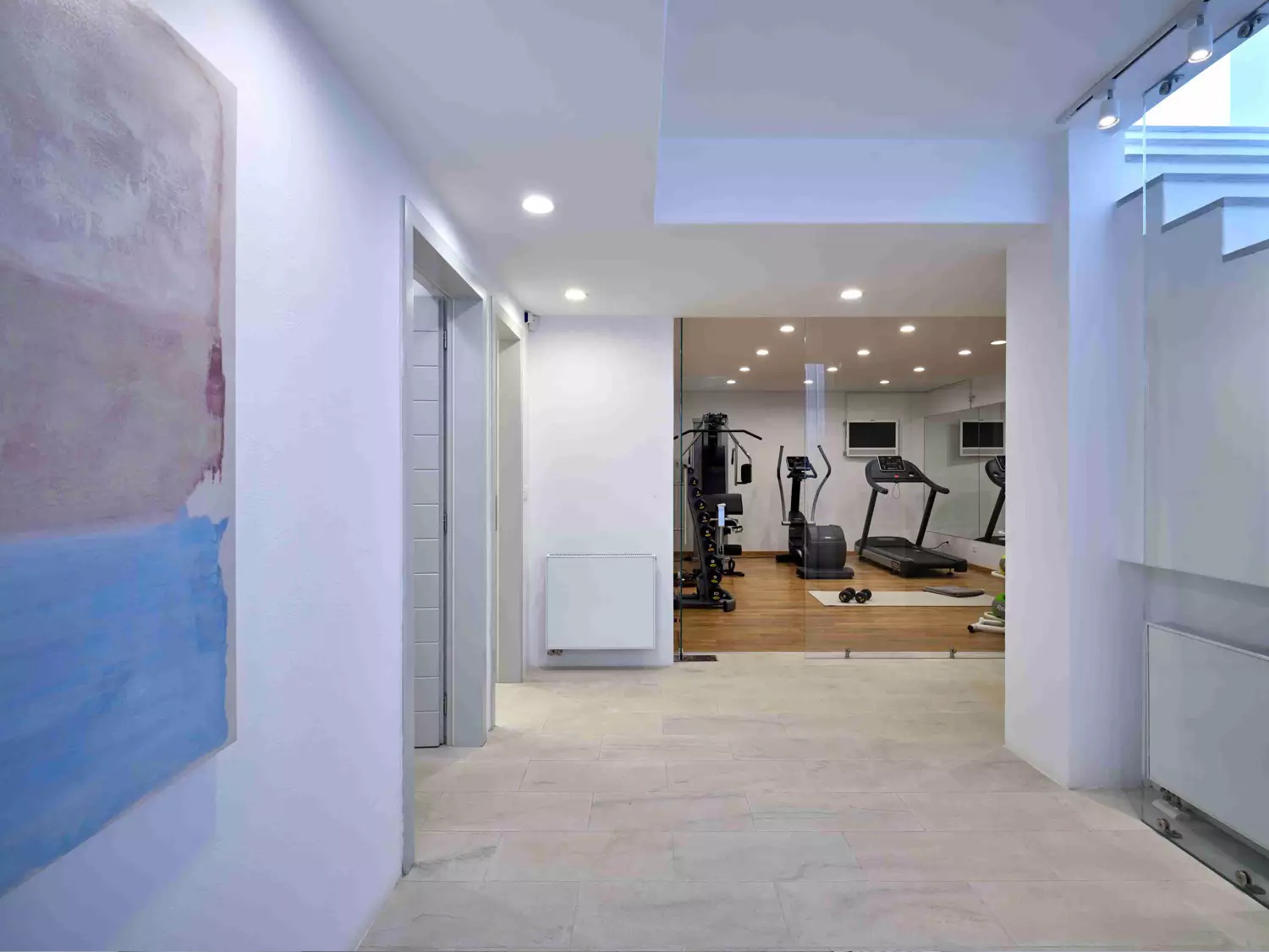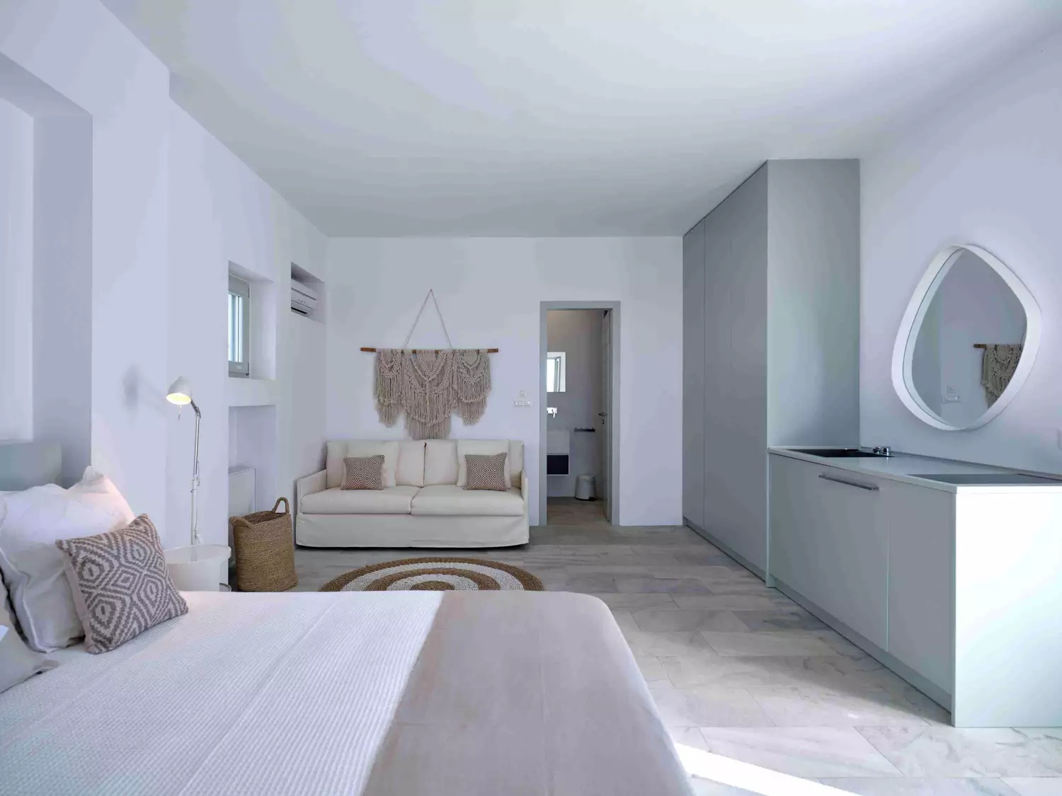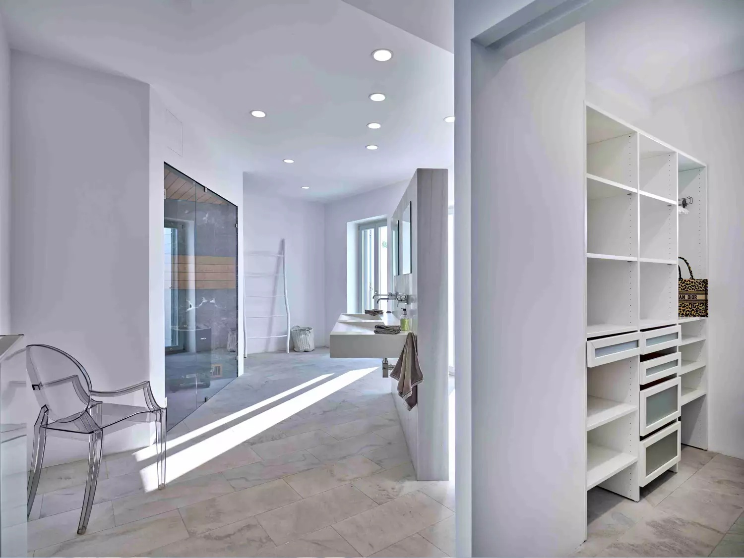As soon as you enter the house, you will come across a voluminous living room where the white and off-white colors are the prevailing sensation of the space along with the totally minimal furnishings. This is an open-plan space that also features the contemporary, fully equipped kitchen and the dining area of the villa. A master bedroom with walk-in closet, en-suite bathroom and sauna for four is found further in the ground level. The property also features 4 more double en-suite bedrooms independently accessed from the terrace with kitchenette and queen size sofa beds.