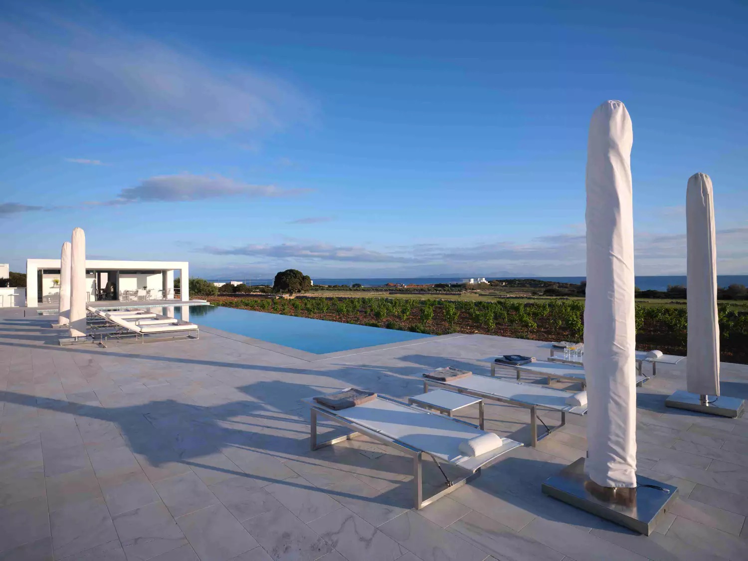Despite its total minimalism, the villa is quite generous when it comes to diversified facilities: a wine cellar and fitness room are located on its lower level while, outside, guests can practice tennis in the villa’s private court and, at night, indulge in an atmospheric movie under the starlit sky in the movie area with a projector. Surrounded by grapevines, gardens with local and Mediterranean herbs and olive trees, the villa’s vast pool terrace features its 25m long swimming pool, several lounging spots and a pergola shaded sitting and dining area, a small bar and a professional barbecue kitchen.